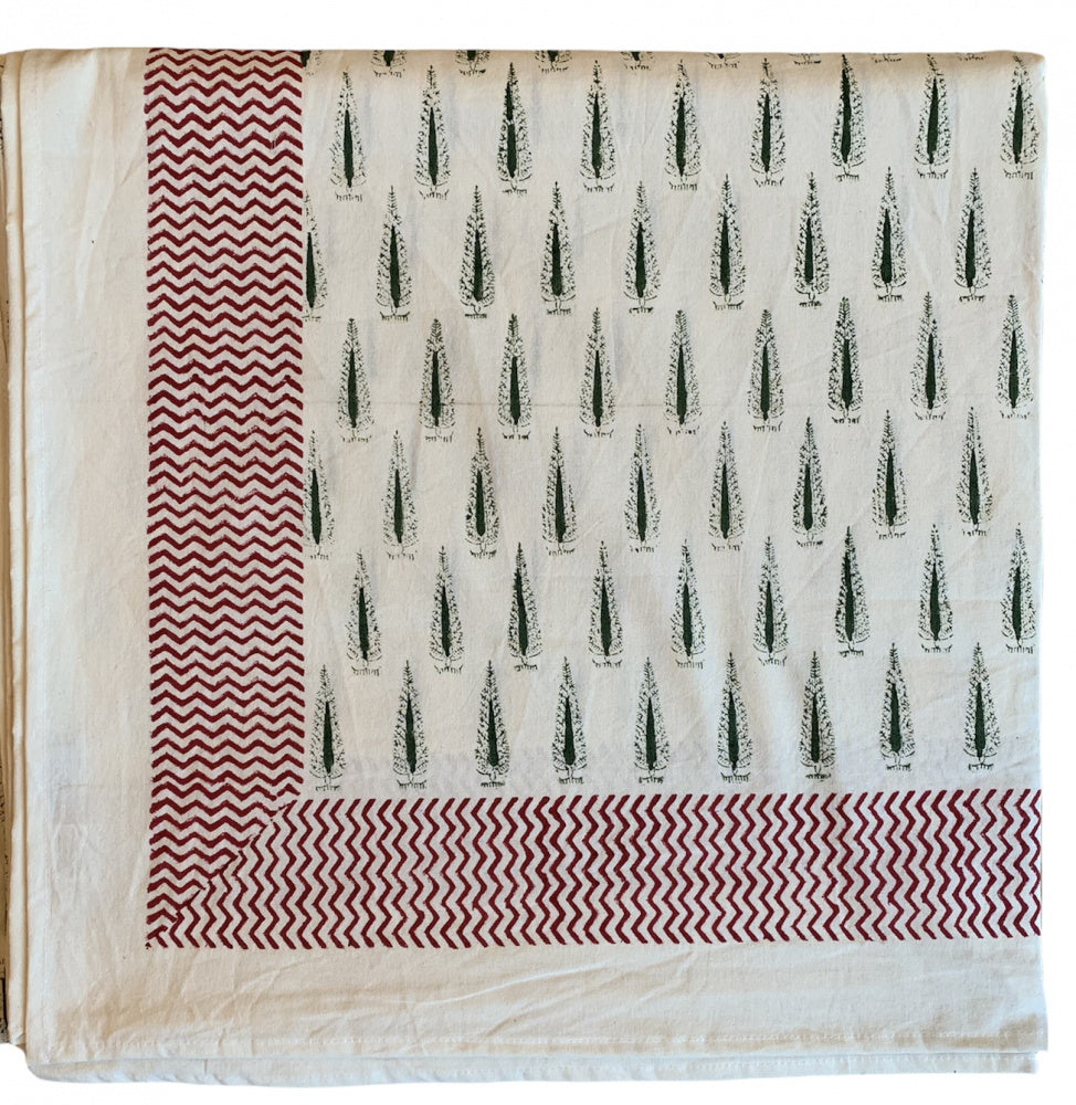 Blokktrykket duk med grønne trær og rød bord. Vil gjøre seg ekstra godt til borddekkingen til jul og vinter.
