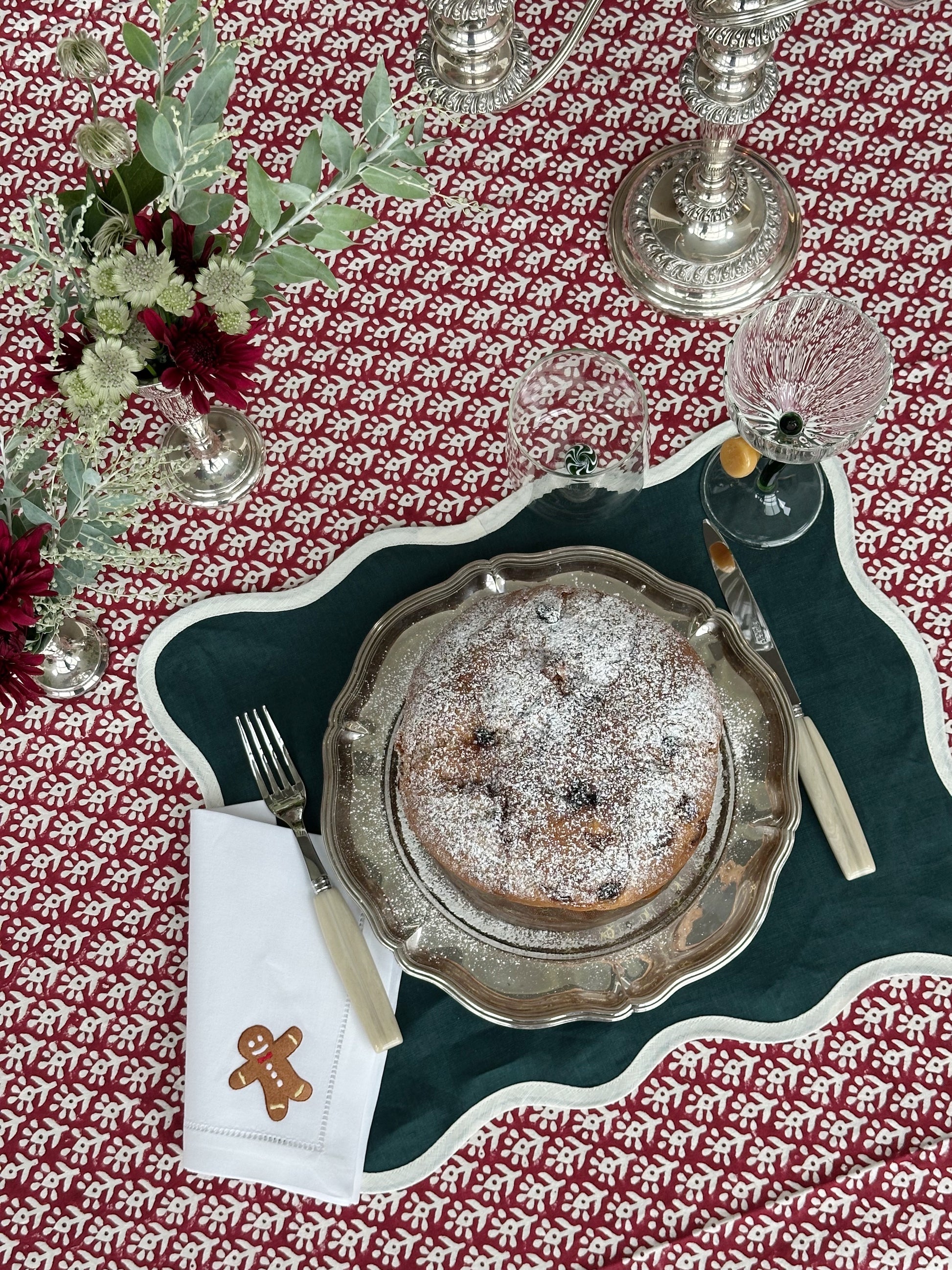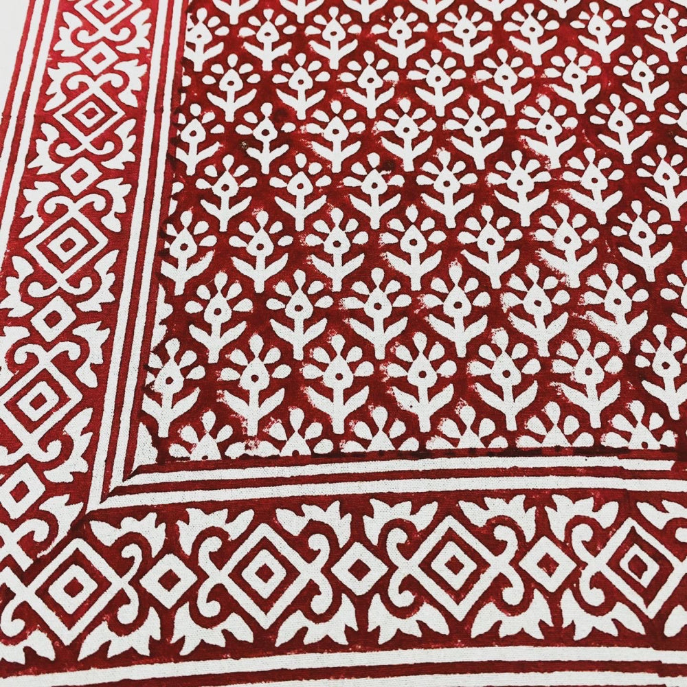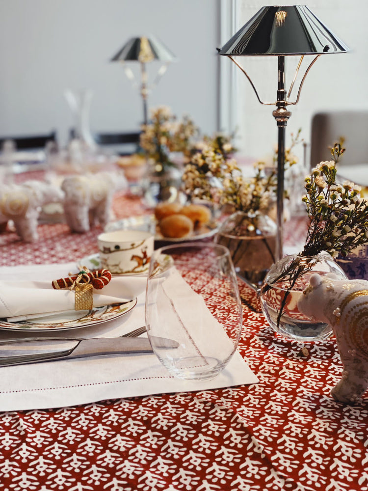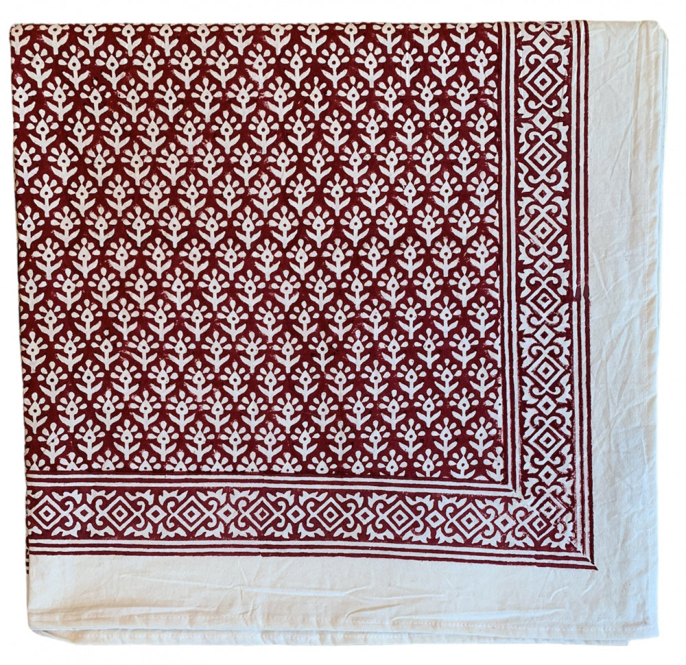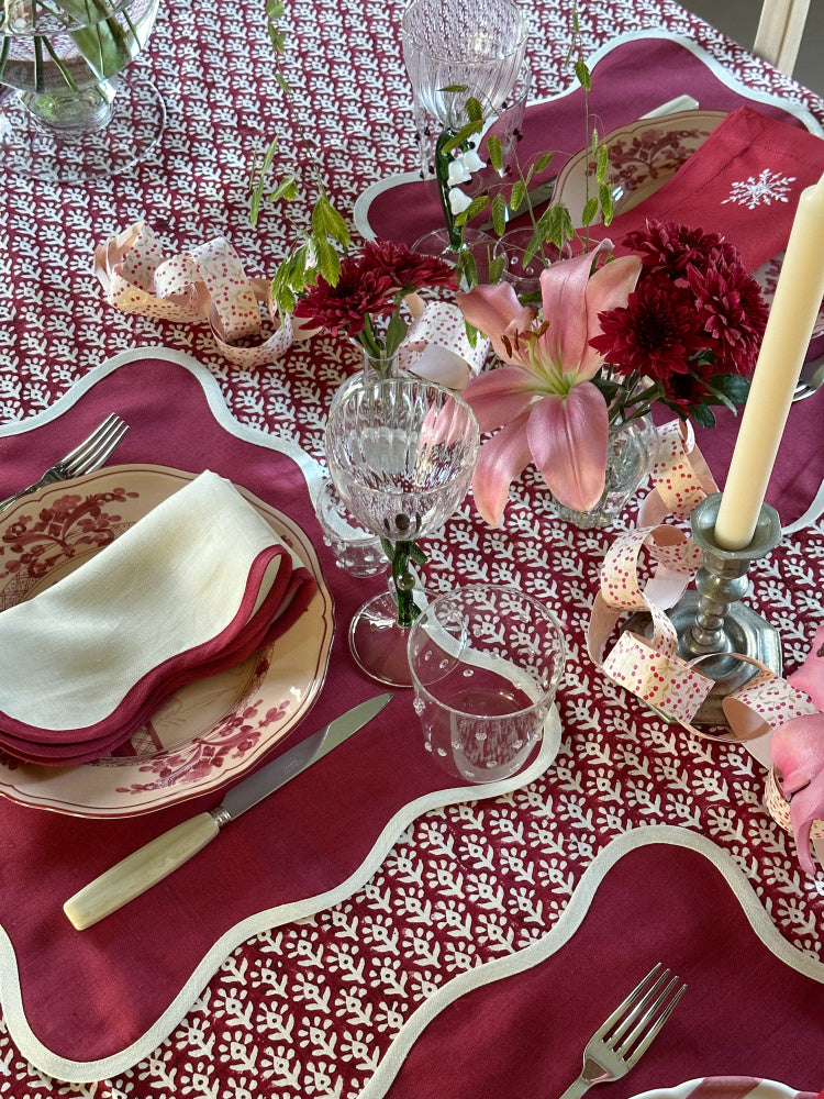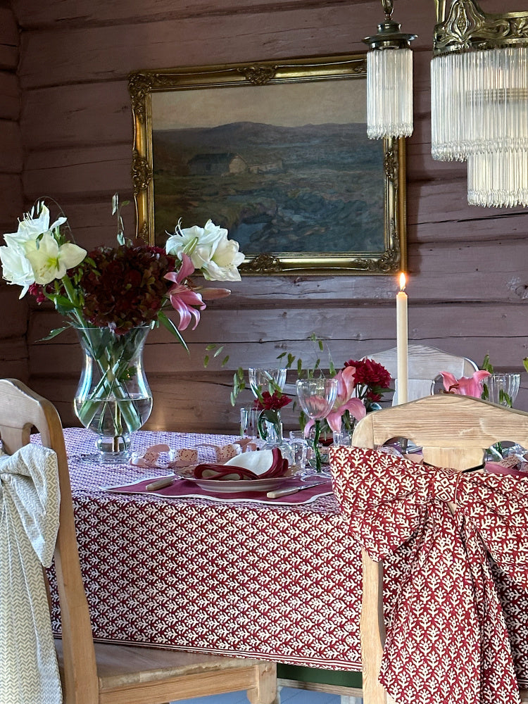 Vår bestselgende duk til jul er tilbake! Nydelig duk trykt for hånd i dyp rød til julens borddekking. Skaper et lunt og stemningsfullt uttrykk, gjerne med serviset eller elementer i grønt eller hvitt.