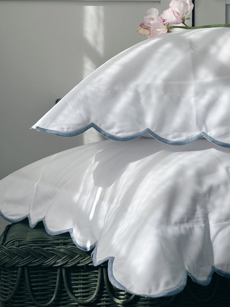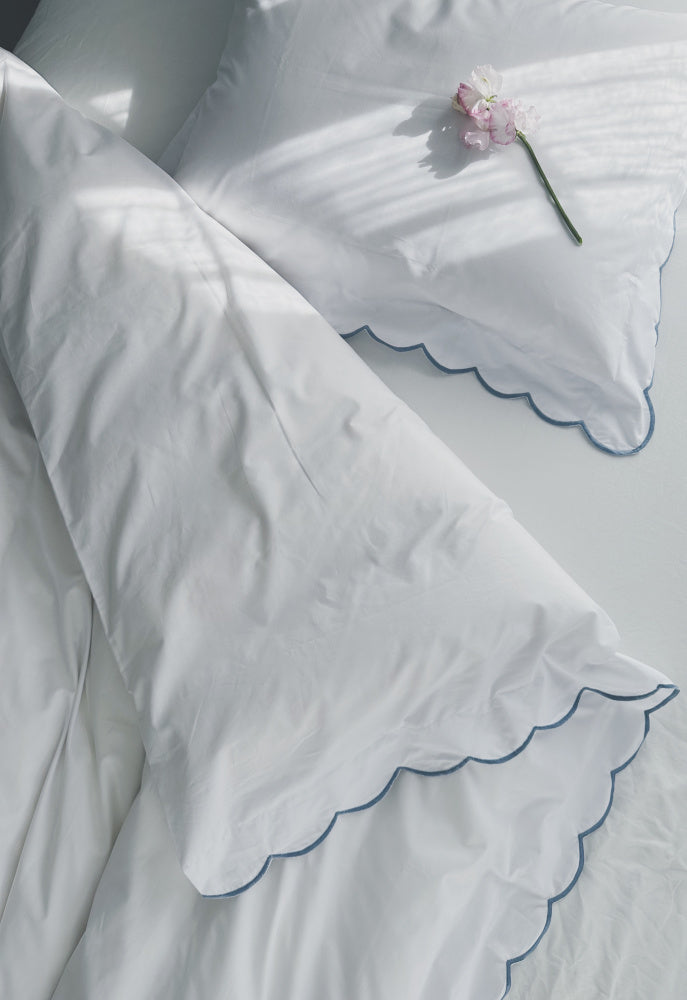 Den dekorative bølgekanten er brodert i en støvet blå farge, og gir et lekent og sofistikert uttrykk som løfter hele soverommet. Hver eneste søm er utført med presisjon hos vår familiedrevne fabrikk i Portugal, som har over 100 års erfaring med tekstilproduksjon.