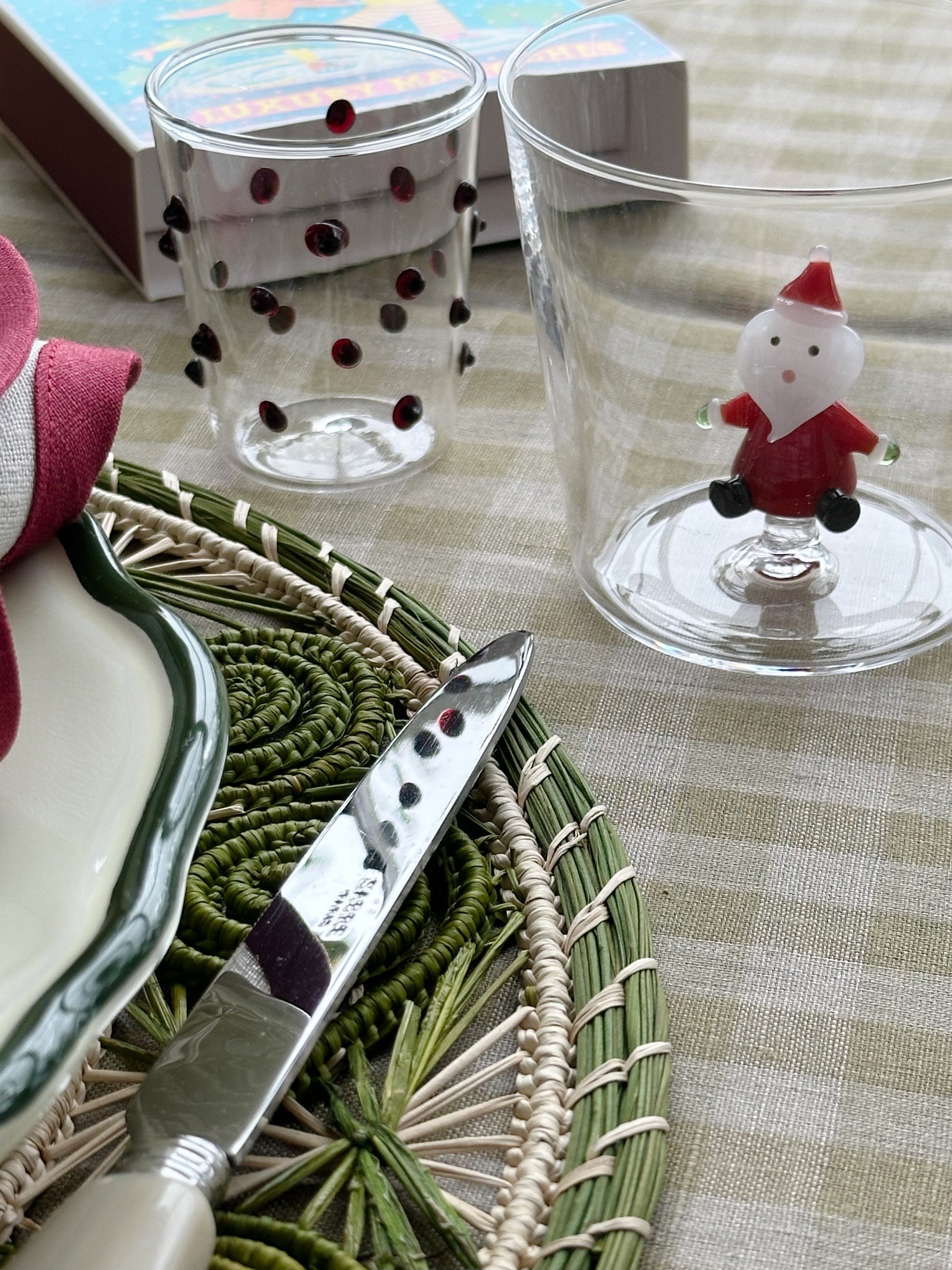 Herlig håndlaget glass med selveste julenissen på innsiden. Bruk den til julens drinker eller til borddekkingen. En perfekt gave.