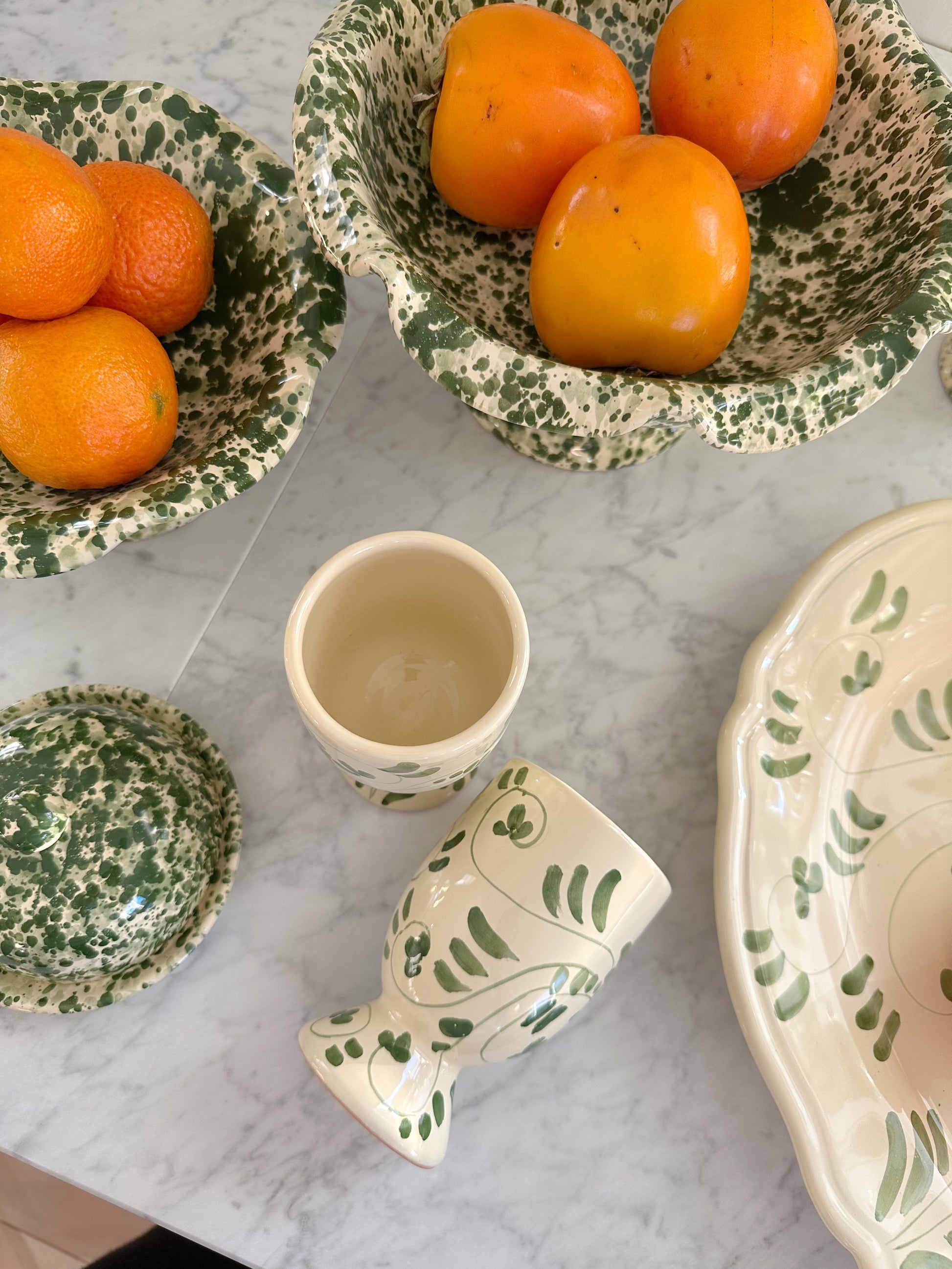 Med inspirasjon fra italiensk keramikk fra 50-tallet skaper disse vakre koppene med fot en lun stemning. Kan brukes til vin, kaffe, gløgg, kakao eller som glass til tannbørster.