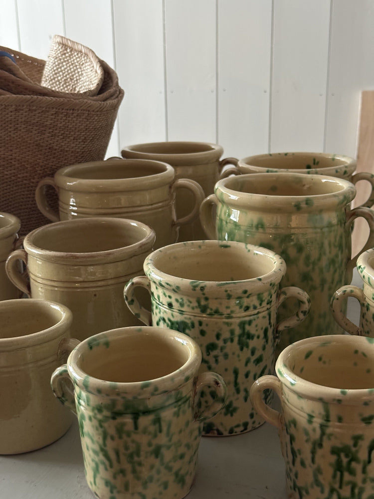 Vakker krukke med ører i en varm kremfarget glasur med grønne flekker. Krukkene er perfekte til oppbevaring av kjøkkenredskaper, til blomster og den minste bruker vi til syltetøy eller på badet.