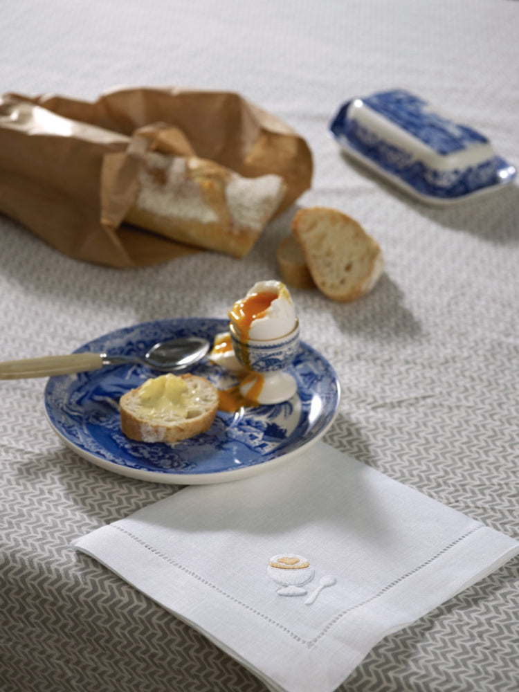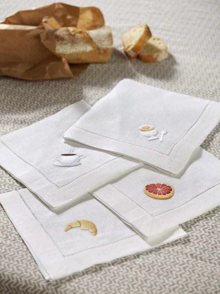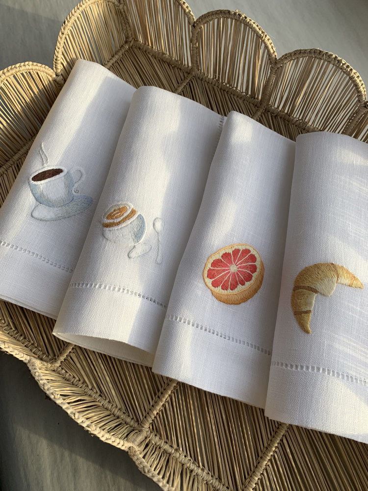 Vi har designet de nydeligste linservietter til frokostbordet. Håndbroderte med fire ulike motiver av grapefrukt, croissant, en kaffe kopp og et eggeglass.