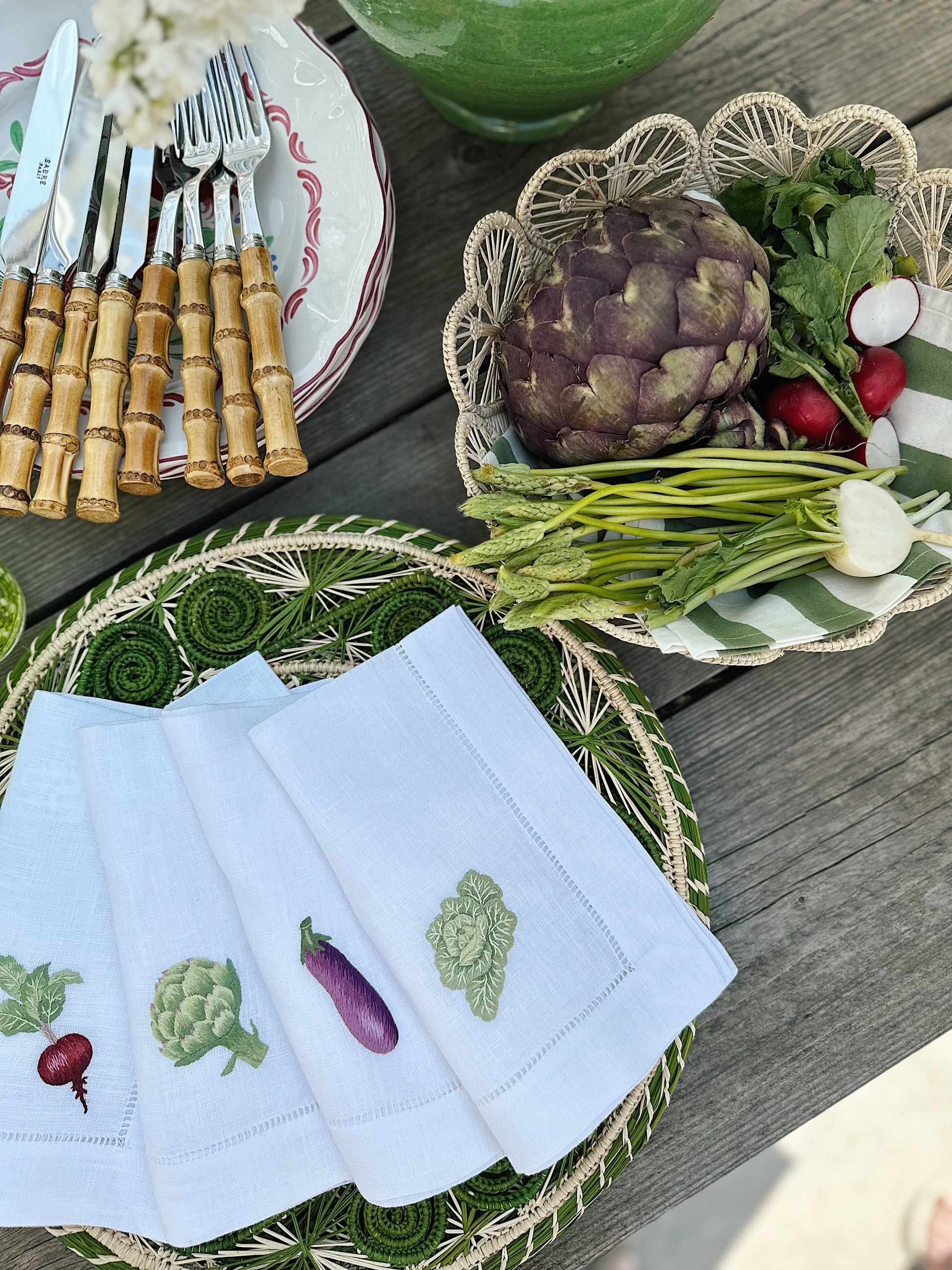 Linservietter med herlige håndbroderte motiver av ulike grønnsaker med grønn hullsøm.