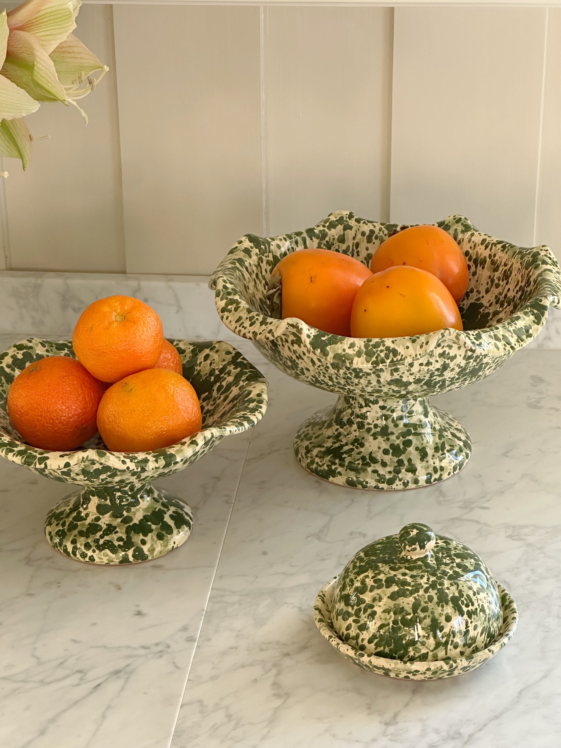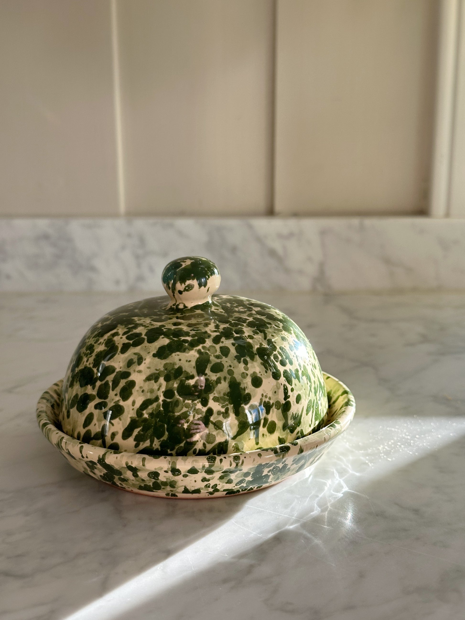 Nydelig smørklokke til å ha på bordet eller benken. Holder smøret temperert og friskt. Spruzzi design i grønt på kremhvit base.